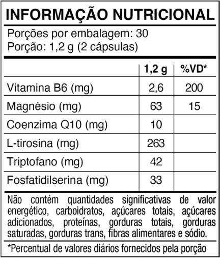 L-tirosina, taurato de magnésio (TauroMag®), óxido de magnésio, fosfatidilserina de lecitina de soja, L-triptofano, coenzima Q10, cloridrato de piridoxina (vitamina B6) e antiumectantes (carbonato de cálcio, dióxido de silício e estearato de magnésio).