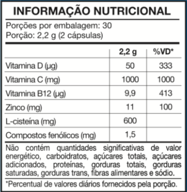 Ácido ascórbico (vitamina C), N-acetil L-cisteína (cisteína), bisglicinato de zinco, extrato de própolis, colecalciferol (vitamina D3), cianocobalamina (vitamina B12), celulose microcristalina, antiumectantes (dióxido de silício e carbonato de cálcio) e estearato de magnésio.