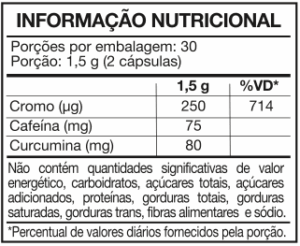 Polpa de laranja amarga em pó, quitosana, psyllium em pó, extrato de rizomas de Curcuma longa, cafeína, picolinato de cromo e antiumectantes estearato de magnésio e dióxido de silício. Composição da cápsula: gelatina.