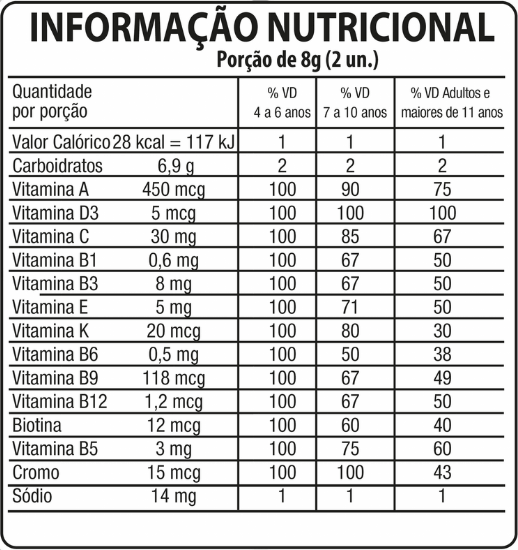 Açúcar, xarope de glicose, Vitamina C (ácido ascórbico), Vitamina B3 (nicotinamida), Vitamina E (acetato de alfa tocoferol), vitamina B5 (pantotenato de cálcio), vitamina B1 (mononitrato de tiamina), vitamina B6 (cloridrato de piridoxina), vitamina A (palmitato de retinol), vitamina B9 (ácido fólico), vitamina K (fitomenadiona), cromo (picolinato de cromo), biotina, vitamina D3 (colecalciferol), vitamina B12 (cianocobalamina), agente de brilho (óleo vegetal e glaceante cera de carnaúba), estabilizantes pectina e maltitol, acidulante ácido cítrico, regulador de acidez citrato de sódio, aromatizantes, corantes artificiais vermelho 40 e azul brilhante FCF.