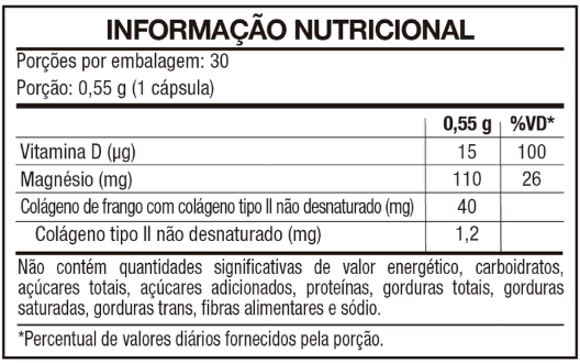 Malato de magnésio, colágeno de frango com colágeno tipo II não desnaturado, colecalciferol, glaceante celulose microcristalina, lubrificante estearato de magnésio e corante natural cúrcuma.